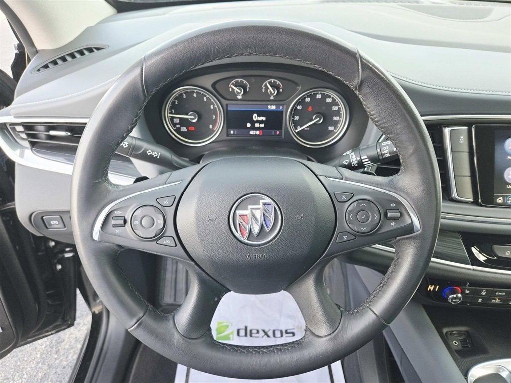 This Enclave is well equipped with Front Mounting License Plate Bracket Package, Preferred Equipment Group 1SL, Sound & Sites Package (120-Volt Power Outlet, Bose Performance-Enhanced 10-Speaker System, Radio: Buick Infotainment Sys AM/FM Stereo w/Nav, and SiriusXM w/360L), Sport Touring Edition (Sport Grille w/Body-Color Surround, Sport Touring Liftgate Badging, and Wheels: 20 Bright Machined Faced Aluminum), 4D Sport Utility, 3.6L V6 SIDI VVT, FWD, Ebony Twilight Metallic, 18 Painted Aluminum Wheels, 3.49 Axle Ratio, 3rd row seats: split-bench, 4-Wheel Disc Brakes, 6 Speakers, 6-Speaker Audio System Feature, 7-Passenger Seating, ABS brakes, Air Conditioning, Alloy wheels, AM/FM radio: SiriusXM with 360L, Apple CarPlay/Android Auto, Auto High-beam Headlights, Auto-dimming door mirrors, Auto-dimming Rear-View mirror, Automatic temperature control, Brake assist, Bumpers: body-color, Compass, Delay-off headlights, Driver door bin, Driver vanity mirror, Dual front impact airbags, Dual front side impact airbags, Electronic Stability Control, Emergency communication system: OnStar and Buick connected services capable, Four wheel independent suspension, Front anti-roll bar, Front Bucket Seats, Front Center Armrest, Front dual zone A/C, Front reading lights, Fully automatic headlights, Garage door transmitter, Heated door mirrors, Heated Driver & Front Passenger Seats, Heated front seats, Illuminated entry, Leather steering wheel, Low tire pressure warning, Occupant sensing airbag, Outside temperature display, Overhead airbag, Overhead console, Panic alarm, Passenger door bin, Passenger vanity mirror, Perforated Leather-Appointed Seat Trim, Power door mirrors, Power Driver Lumbar Control Seat Adjuster, Power driver seat, Power Liftgate, Power Passenger Lumbar Control Seat Adjuster, Power passenger seat, Power steering, Power windows, Premium audio system: Buick Infotainment System, Radio data system, Radio: Buick Infotainment System AM/FM Stereo, Rear air conditioning, Rear anti-roll bar, Rear Parking Sensors, Rear reading lights, Rear window defroster, Rear window wiper, Remote keyless entry, Roof rack: rails only, Security system, Speed control, Speed-sensing steering, Spoiler, Steering wheel mounted audio controls, Tachometer, Telescoping steering wheel, Tilt steering wheel, Traction control, Trip computer, Turn signal indicator mirrors, Variably intermittent wipers, and Voltmeter.
