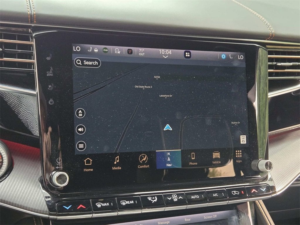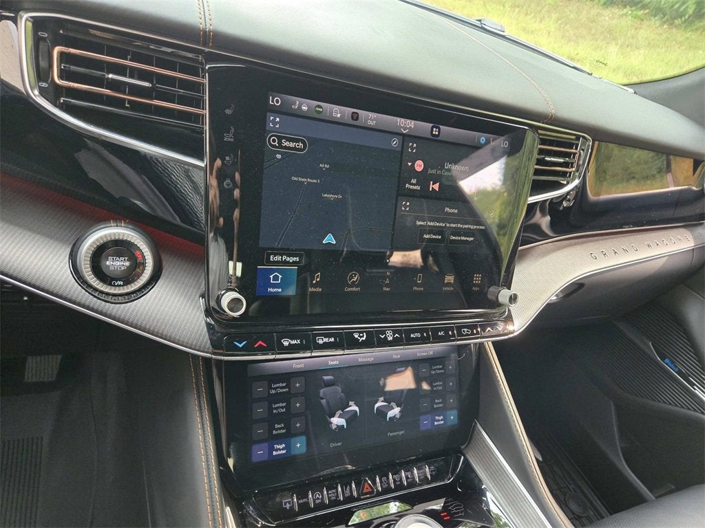 This Grand Wagoneer is well equipped with HD Trailer Tow Package (Heavy-Duty Engine Cooling, Removable Rear Tow Hook, Trailer Brake Control, and Trailer Hitch Zoom), MOPAR Interior Protection Package (All-Season Floor Mats and Cargo Tray), Obsidian Appearance Package, Quick Order Package 28T Obsidian (Black Interior Accents, Black Roof, Gloss Black Upper & Lower DLO Molding, Piano Black Exterior Accents, and Wheels: 22 x 9.0 Tinted Polished w/Black Insert), Rear Seat Video Group 1 (Amazon Fire TV Built-In, Seatback Video Screens, and Video USB Port), Two Tone Paint Group, Grand Wagoneer Series III w/ Obsidian Appearance Package, 3.0L I6, 4WD, Diamond Black Crystal Pearlcoat, Global Black Leather, 3.92 Rear Axle Ratio, 3rd row seats: bench, 4-Wheel Disc Brakes, ABS brakes, Adjustable pedals, Air Conditioning, Alloy wheels, AM/FM radio: SiriusXM with 360L, Anti-whiplash front head restraints, Apple CarPlay/Android Auto, Audio memory, Auto High-beam Headlights, Auto-dimming door mirrors, Auto-dimming Rear-View mirror, Auto-leveling suspension, Automatic temperature control, Body Color Roof w/PXJ, Brake assist, Bumpers: body-color, Compass, Delay-off headlights, Driver door bin, Driver vanity mirror, Driver's Seat Mounted Armrest, Dual front impact airbags, Dual front side impact airbags, Electronic Stability Control, Emergency communication system: Wagoneer Connect, Four wheel independent suspension, Front anti-roll bar, Front Bucket Seats, Front Center Armrest w/Storage, Front dual zone A/C, Front fog lights, Front reading lights, Fully automatic headlights, Garage door transmitter, Genuine wood console insert, Genuine wood dashboard insert, Genuine wood door panel insert, Heads-Up Display, Heated door mirrors, Heated front seats, Heated rear seats, Heated steering wheel, Illuminated entry, Knee airbag, Leather steering wheel, Low tire pressure warning, Memory seat, Navigation System, Night vision lights, Normal Duty Suspension, Occupant sensing airbag, Outside temperature display, Overhead airbag, Overhead console, Panic alarm, Passenger door bin, Passenger seat mounted armrest, Passenger vanity mirror, Pedal memory, Power adjustable front head restraints, Power door mirrors, Power driver seat, Power Liftgate, Power moonroof, Power passenger seat, Power steering, Power windows, Premium Leather Trimmed Bucket Seats, Radio data system, Radio: Uconnect 5 Nav w/12.0 Display, Rain sensing wipers, Rear air conditioning, Rear anti-roll bar, Rear dual zone A/C, Rear reading lights, Rear seat center armrest, Rear window defroster, Rear window wiper, Reclining 3rd row seat, Remote keyless entry, Roof rack, Security system, Speed control, Speed-sensing steering, Speed-Sensitive Wipers, Split folding rear seat, Steering wheel memory, Steering wheel mounted audio controls, Tachometer, Telescoping steering wheel, Tilt steering wheel, Traction control, Trip computer, Turn signal indicator mirrors, Variably intermittent wipers, Ventilated front seats, Ventilated rear seats, Voltmeter, and Wheels: 22 x 9.0 Premium 4 Aluminum.
